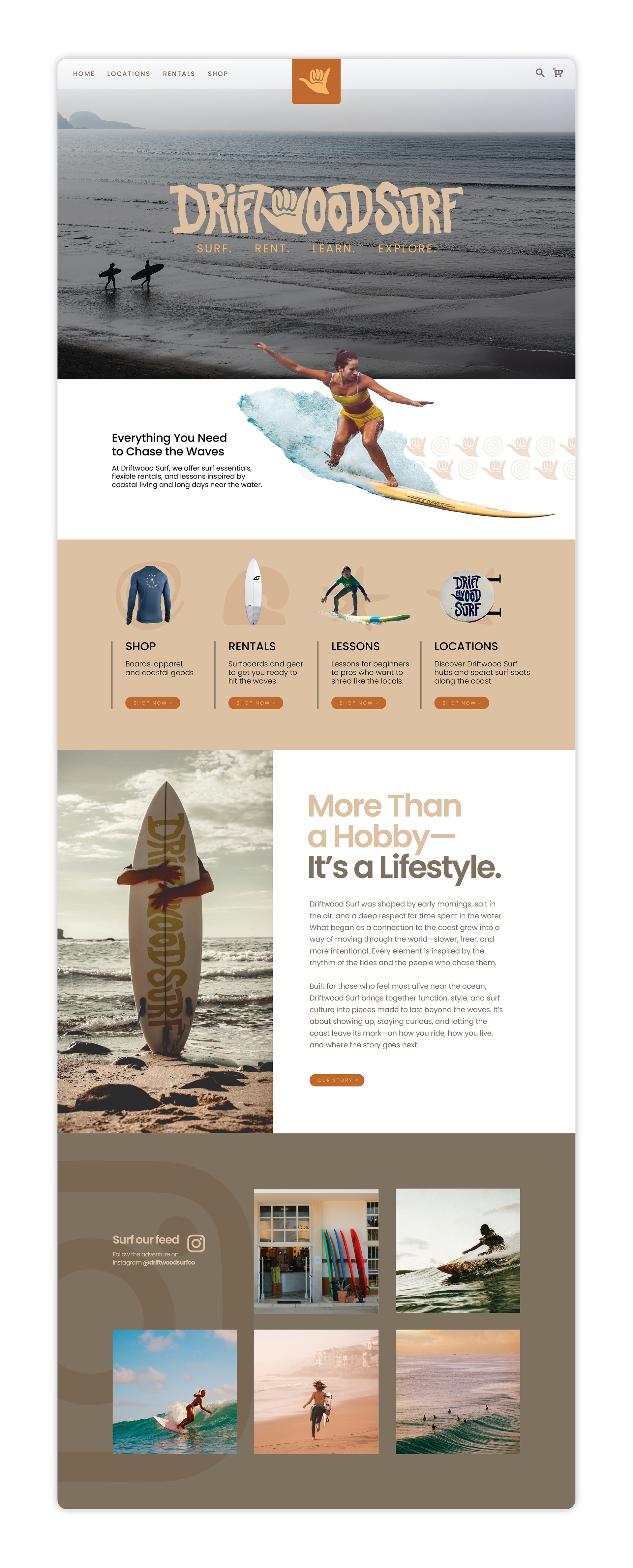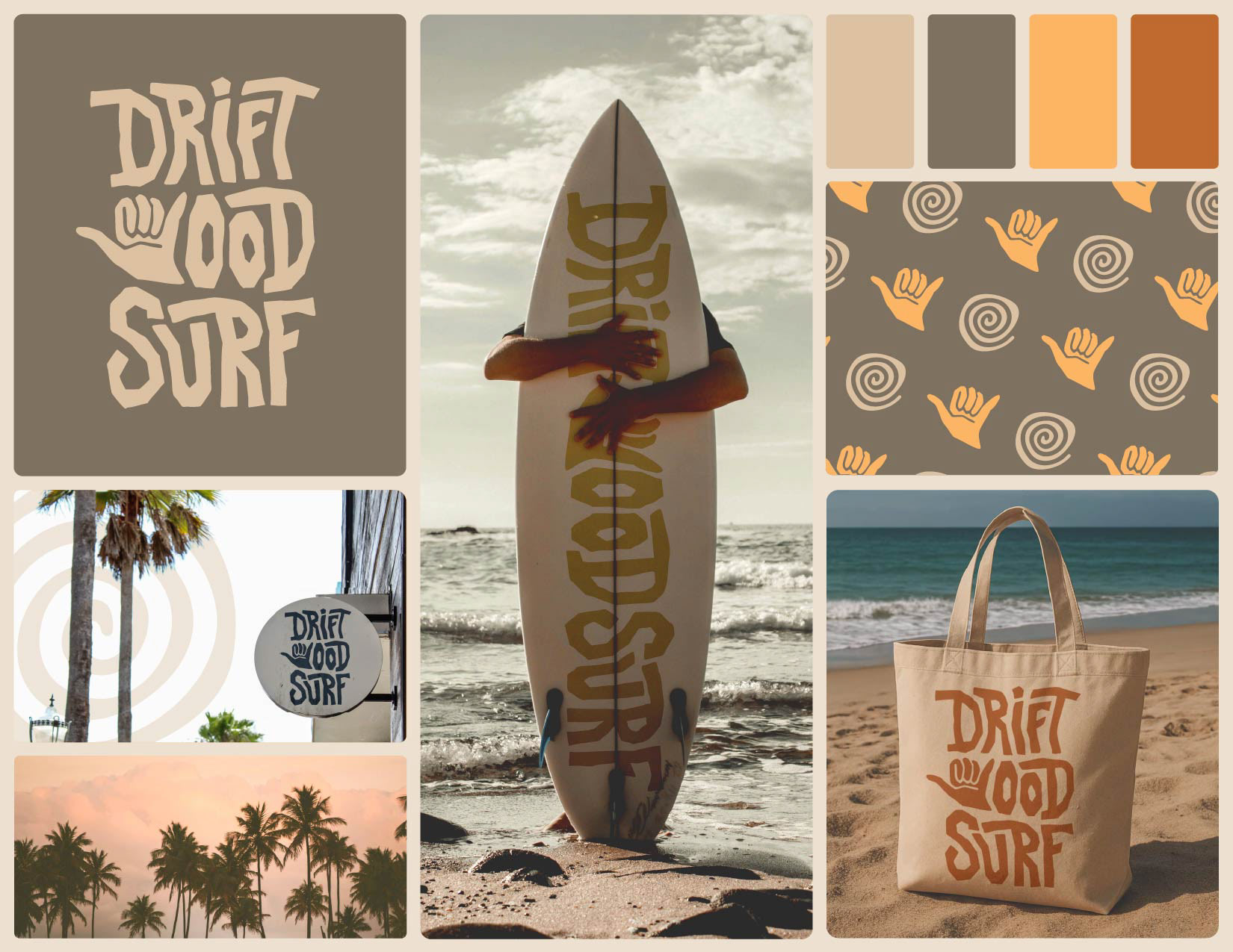 Driftwood Surf is a surf lifestyle brand and surf shop with a warm, beachy vibe. I created a website design and visual identity featuring a warm color palette, clean iconography, and a cohesive pattern system to bring the brand to life across merchandise, social media, and marketing materials. The goal was to capture the relaxed, sun-soaked energy of surf culture while maintaining a modern, versatile look.